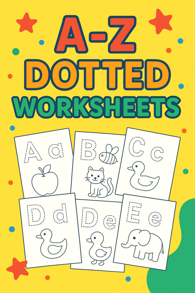 A–Z Dotted Worksheets are printable learning sheets that help kids trace and learn alphabet letters (A to Z) through dotted outlines and fun pictures.