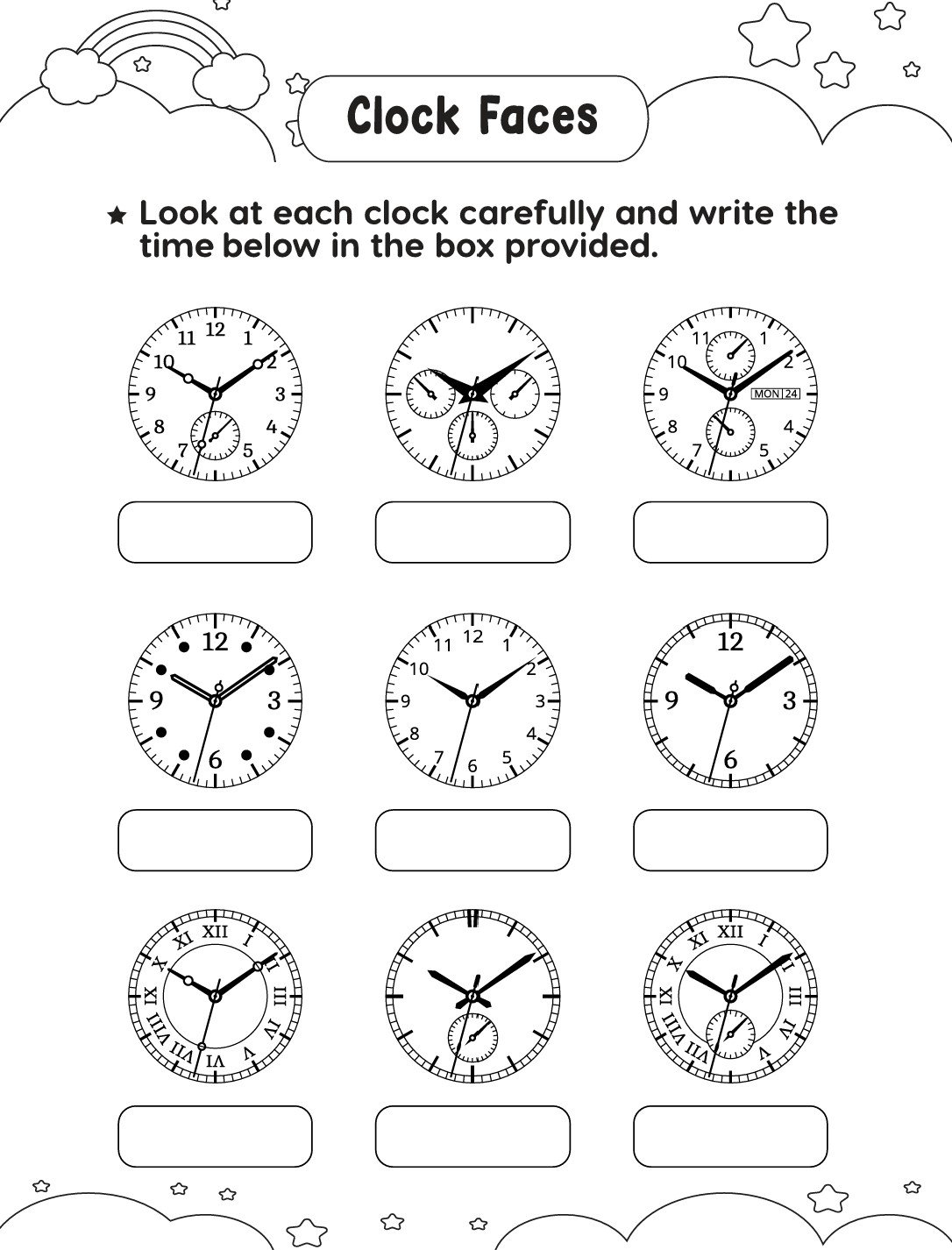 It includes clock drawing, time matching, coloring pages, tracing numbers, and fun quizzes to make time learning exciting.